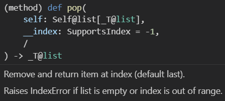 pop()함수 작동시 인덱스가 줄어드는 내용에 관한 정의를 확인할 수 있다.