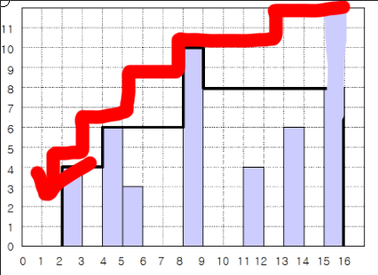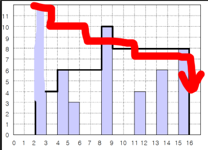 이와 같은 지붕의 형태를 보고 첫 번째로 떠올릴 수 있는 로직은 최댓값 좌 우로 계단식으로 점차 증가해 오면서 최댓값에서만 우뚝 솟아 있는 형식이라고 생각하였다. 하지만 이렇게 생각한 경우 여러 가지의 생각해야 하는 포인트들이 존재한다. 해당 케이스는 아래와 같다.