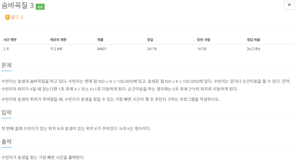 문제의 경우 간단하다. 수빈이와 동생의 위치가 주어지며 수빈이가 동생을 따라잡으면 된다.