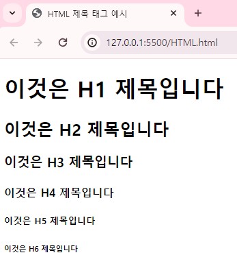 <hn> </hn>태그를 통해 제목을 지정할 수 있다. n은 1부터 6까지 가능하며 숫자가 커질수록 더 작은 크기로 표현된다.