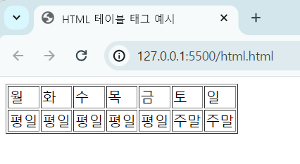 - <table> </table> : 테이블의 큰 부분을 담당한다. border속성을 통해 테이블 칸의 선을 지정할 수 있다.