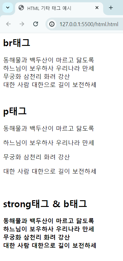 - <strong> & <b> : strong태그와 b태그 둘 다 글자의 굵음을 설정할 수 있다. 웹 페이지에서의 둘의 차이점은 거의 없다고 볼 수 있다.