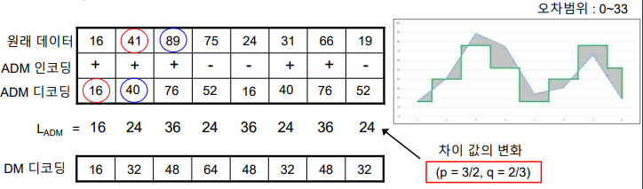 이처럼 (1)처럼 연속으로 증가하거나 연속으로 감소하는 경우, p 을 L에 곱하여 다음 구간에서 활용하고, (2)와 같은 경우에는 차이 값의 규모를 줄이기 위해 q를 L에 곱하여 다음구간에서 활용한다.이처럼 보정을 통하여 DM변조보다 ADM변조가 원래 데이터와의 오차를 더 줄일 수 있는 것이다.