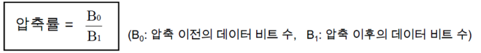 - 압축률: 어느정도 압축이 되었는지 확인할 수 있는 지표, 인코딩 전의 데이터와 인코딩 후의 데이터로 표현한다.