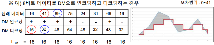 오른쪽 그래프에서 첫번 째 이진테이터 그래프의 증감 부분을 보면, 디지털 신호가 될 이진 그래프 보다 아날로그 신호의 그래프가 더 위에 있기 때문에 DM인코딩 칸에는 +가 들어가게 된다. 이 차이는 L(dm)=16으로 일정하다.