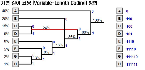 허프만 코딩 ( Huffman Coding)데이터를 구성하는 단위정보들의 빈도수를 기반으로, 각 단위의 정보를 표현하는 비트수 를 효과적으로 할당하는 방법이다.