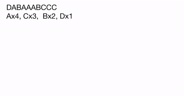 DABAAABCCC를 110 0 111 0 0 0 111 10 10 10과 같이 1100111000111101010로 나타낼 수 있다.
