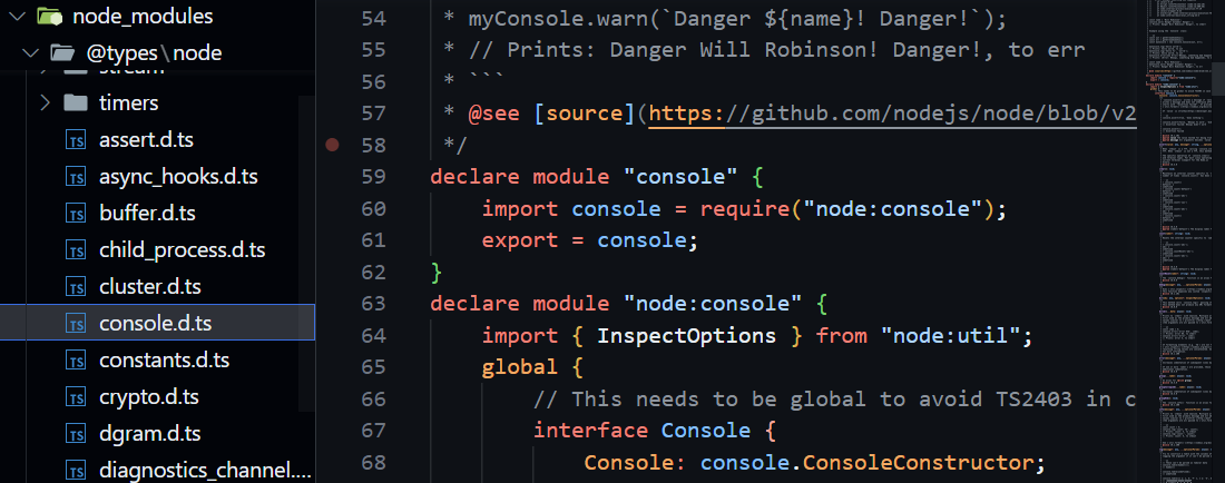 다운로드한 후 node_modules에 들어가면, TypeScript로 console.log에서의 console과 같은 각 다양한 타입에 대해 미리정의되어 있는 것을 확인할 수 있다.